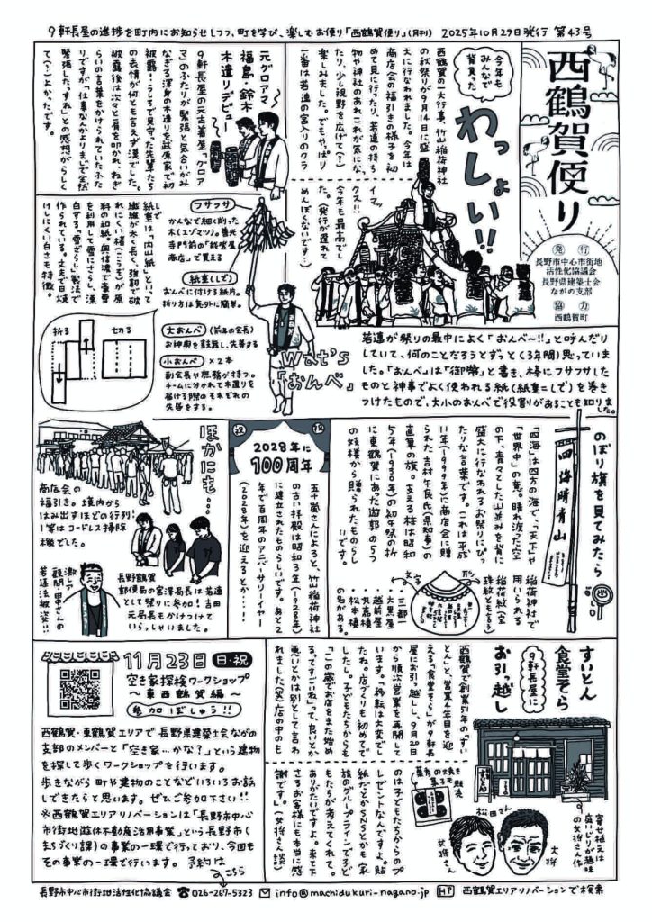 西鶴賀便り 第43号 2026 3/26 西鶴賀エリアリノベーション 2025年10月29日2026年3月26日 西鶴賀便り 第43号 (2025年10月29日) 西鶴賀エリアリノベーション この記事が気に入ったら いいね または フォローしてね! Follow @nkenchikushikai URLをコピーしました! URLをコピーしました! ~終了いたしました~「地震災害時における避難所等の応急危険度判定」実施訓練および市町村防災担当者様との意見交換会 つちおと 令和7年11月 第303号 この記事を書いた人 堀幸一 この著者の記事一覧へ 関連記事 ~終了いたしました~つきいちアーキ・セミナー「第1回 空き家探検ワークショップ ~東西鶴賀編~」開催のご案内 2025年10月18日 西鶴賀便り 第42号 2025年8月29日 西鶴賀便り 第41号 2025年6月30日 西鶴賀便り 第40号 2025年5月31日 西鶴賀便り 第39号 2025年4月30日 西鶴賀便り 第38号 2025年3月31日 西鶴賀便り 第37号 2025年2月25日 西鶴賀便り 第36号 2025年1月24日 コメント コメントする コメントをキャンセルコメント ※ 名前 ※ メール ※ サイト 次回のコメントで使用するためブラウザーに自分の名前、メールアドレス、サイトを保存する。 Δ